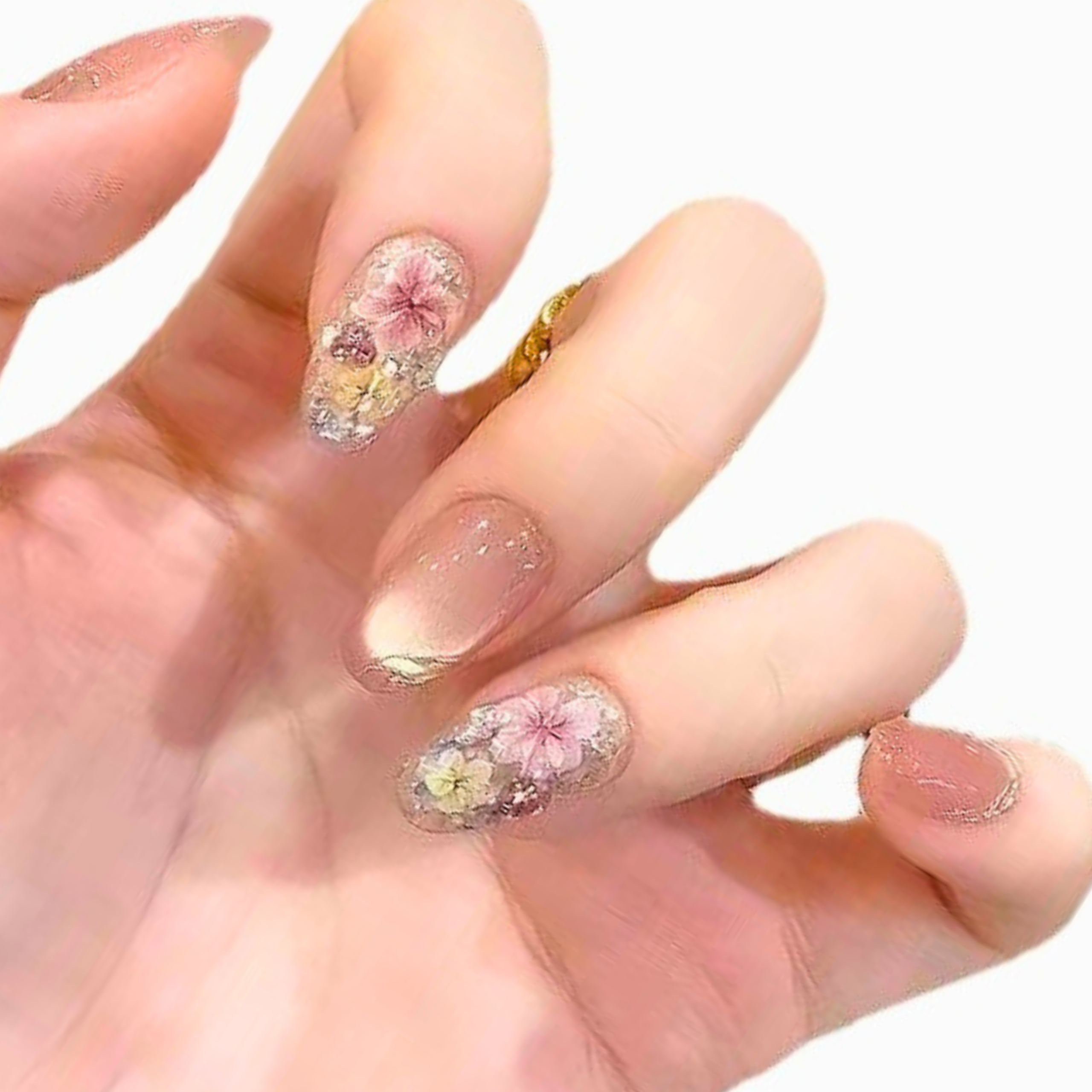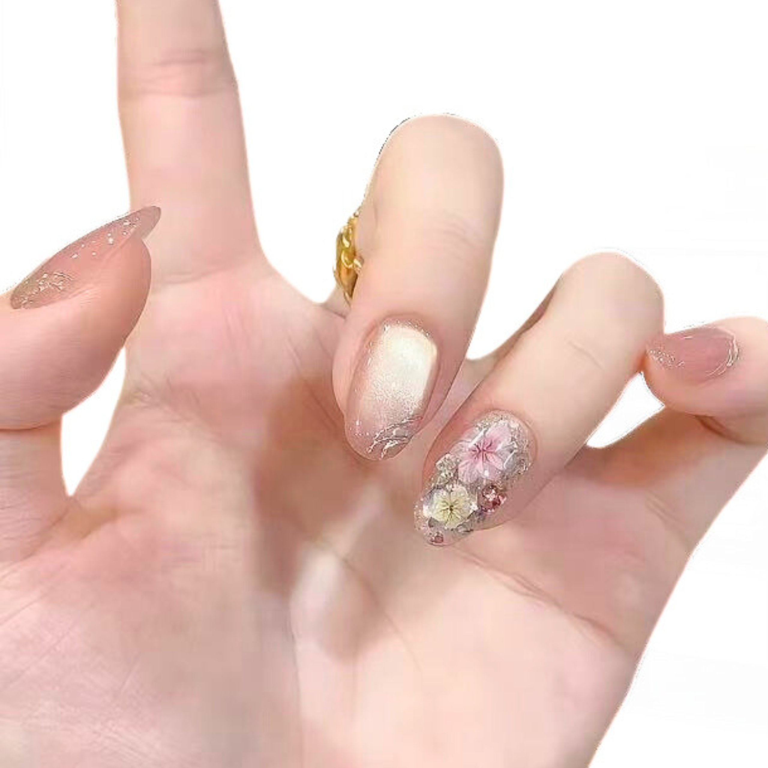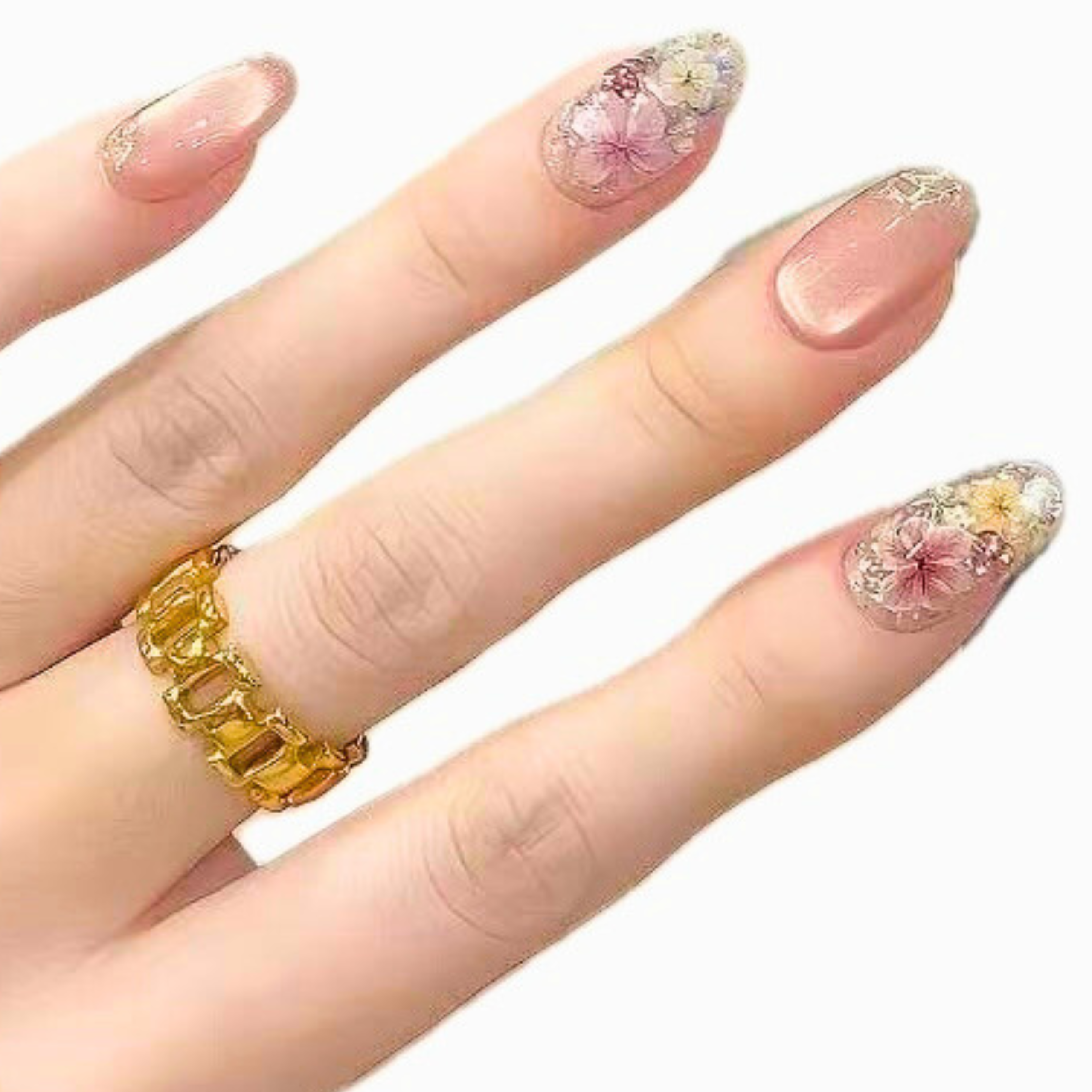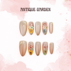 For a vintage look, these round nails feature muted floral prints and shimmering gold edges, perfect for a sophisticated, timeless aesthetic.
