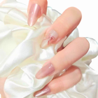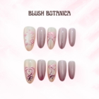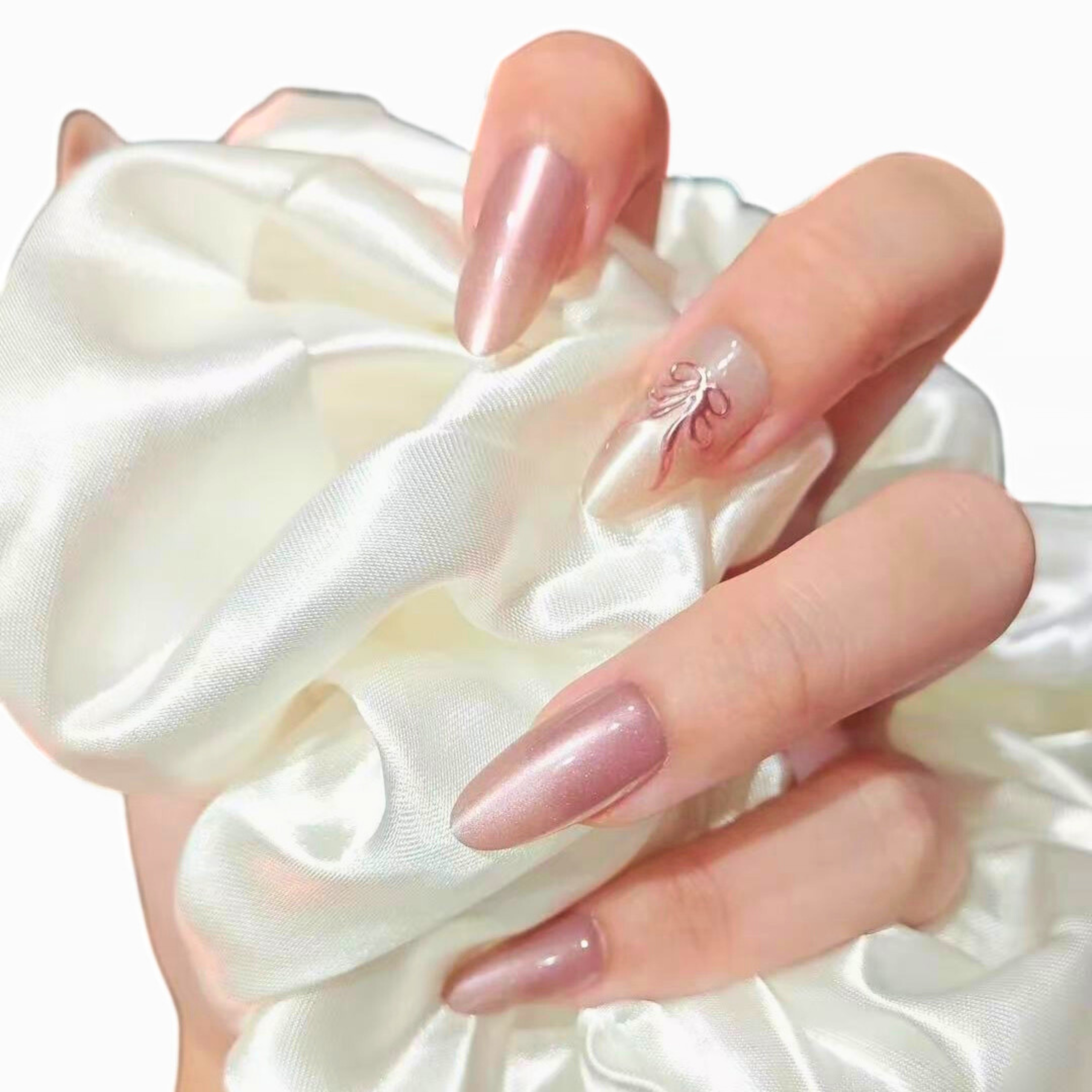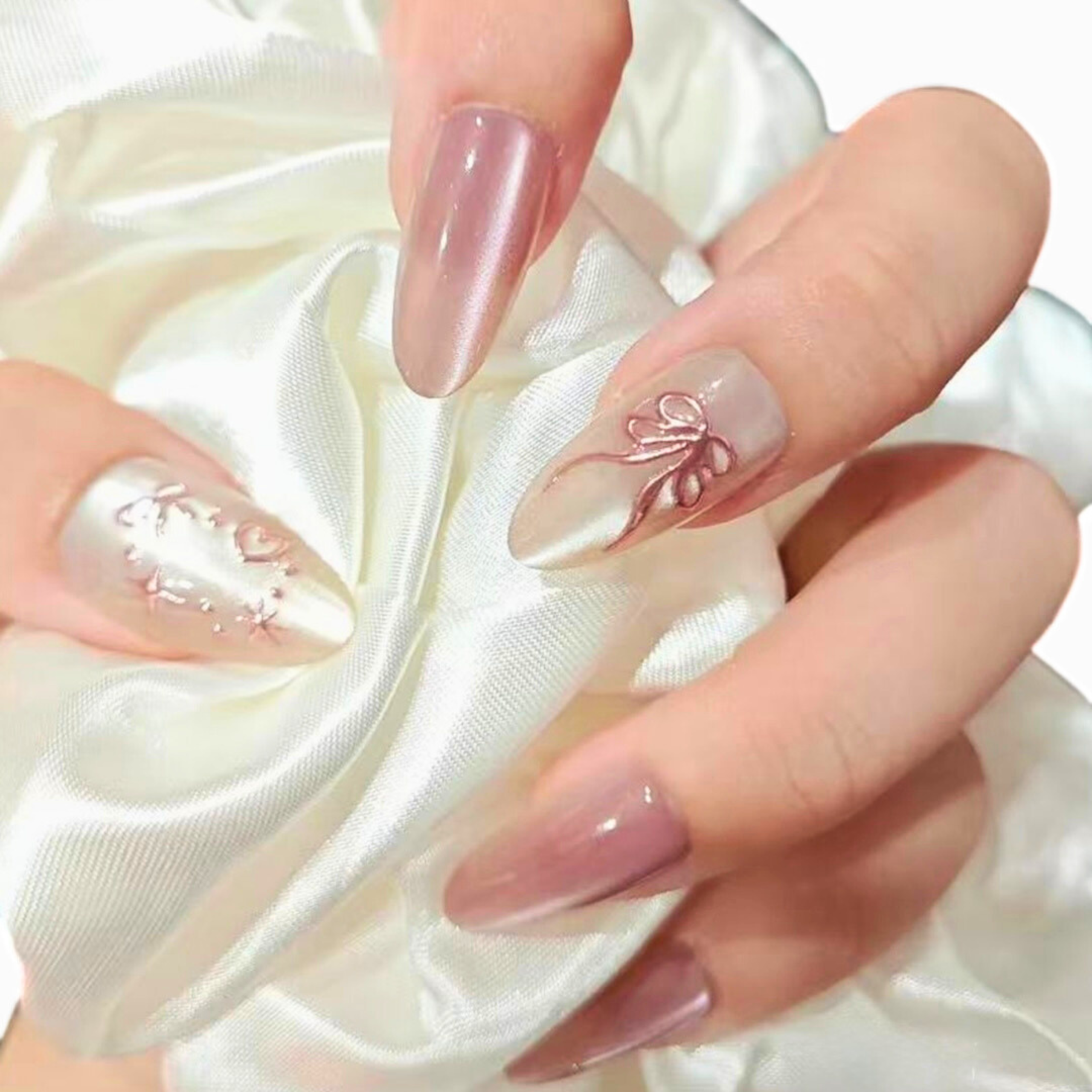 Romantic and feminine. A deep mauve and rose-gold palette with sculpted 3D chrome ribbons and silver leaf accents. It’s jewelry for your fingertips.