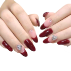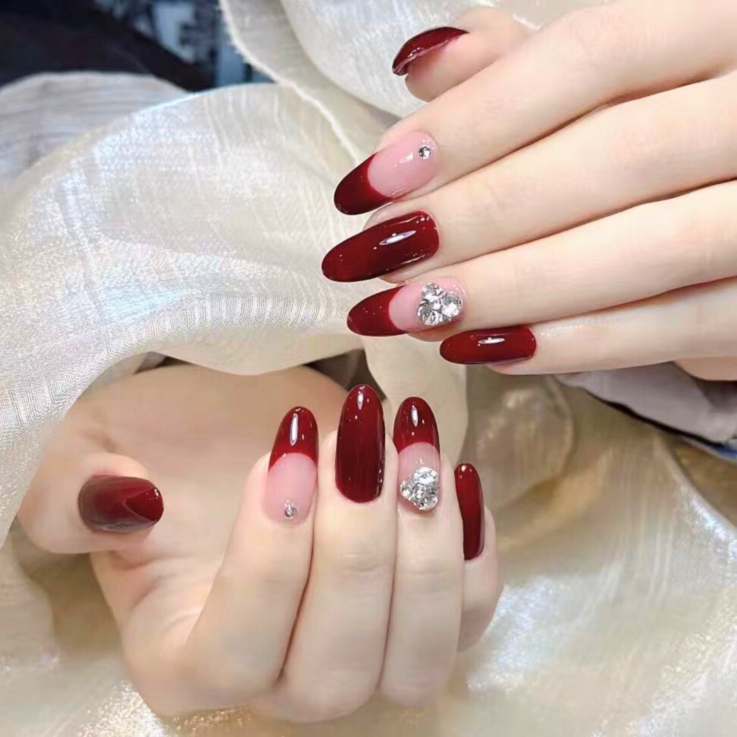 almond-shaped nails in a vibrant, deep red color, with a subtle shimmering effect. Some accent nails are adorned with elegant, sparkling silver rhinestone bows near the cuticle.
