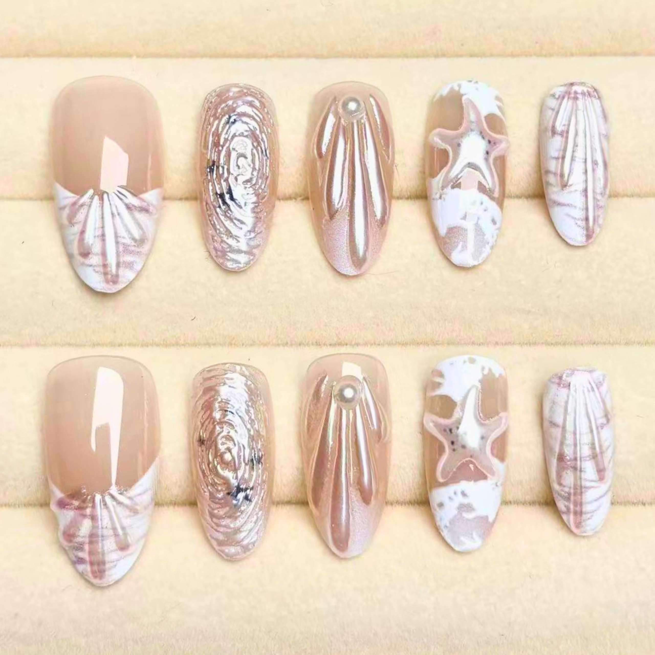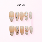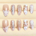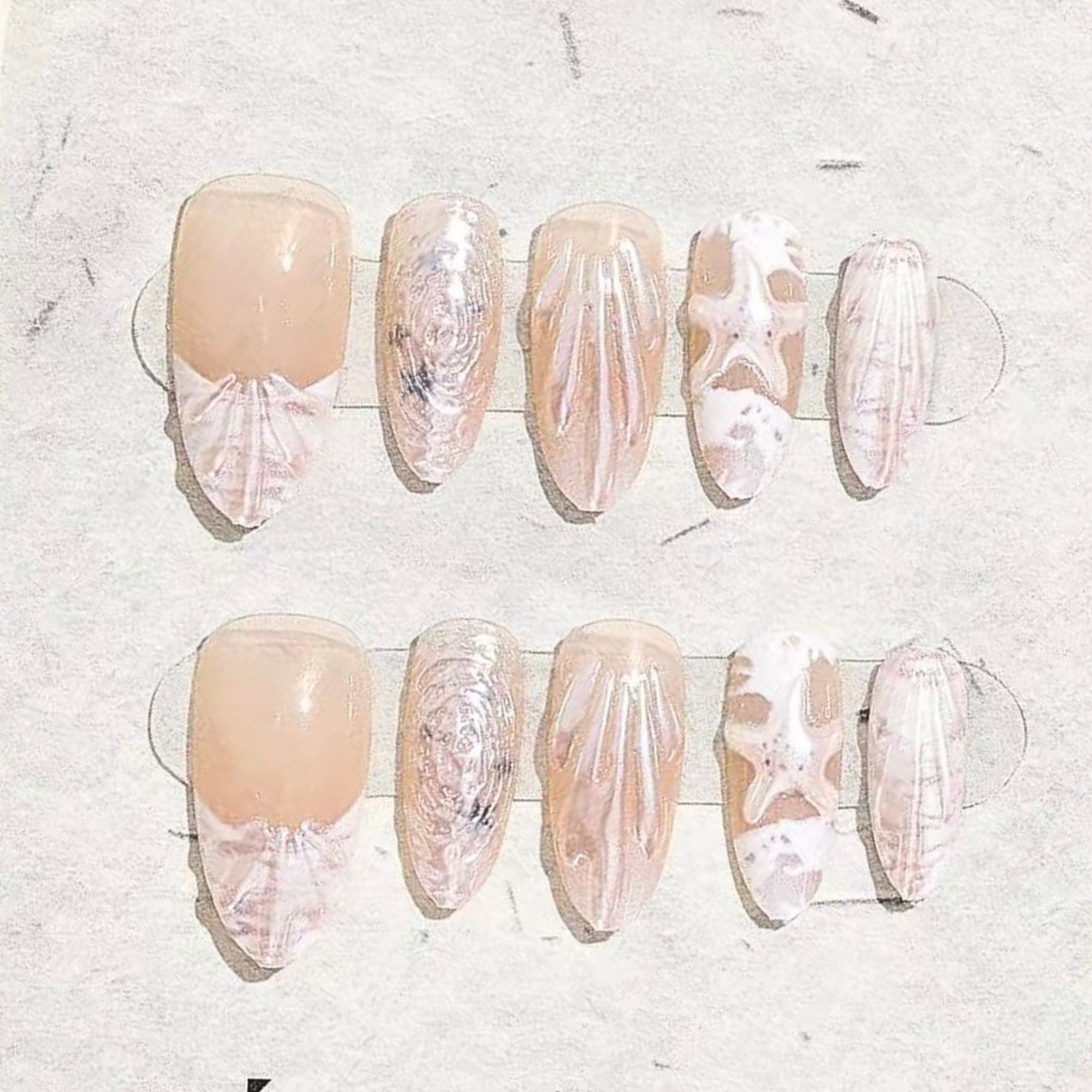 A celestial-inspired nude set featuring soft marble textures, fine gold lines, and translucent layers. Ethereal and modern, ideal for lovers of subtle statement nails.