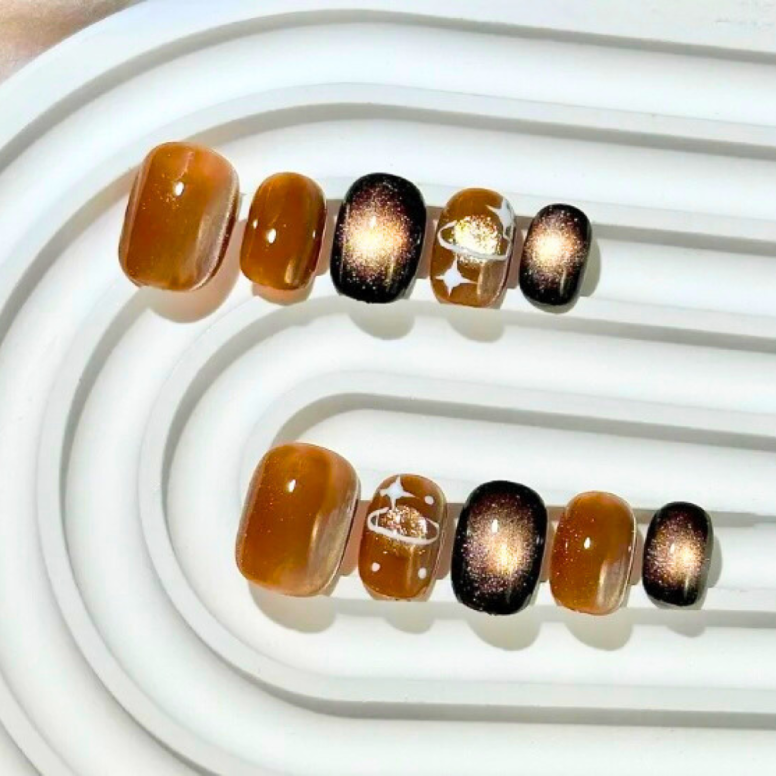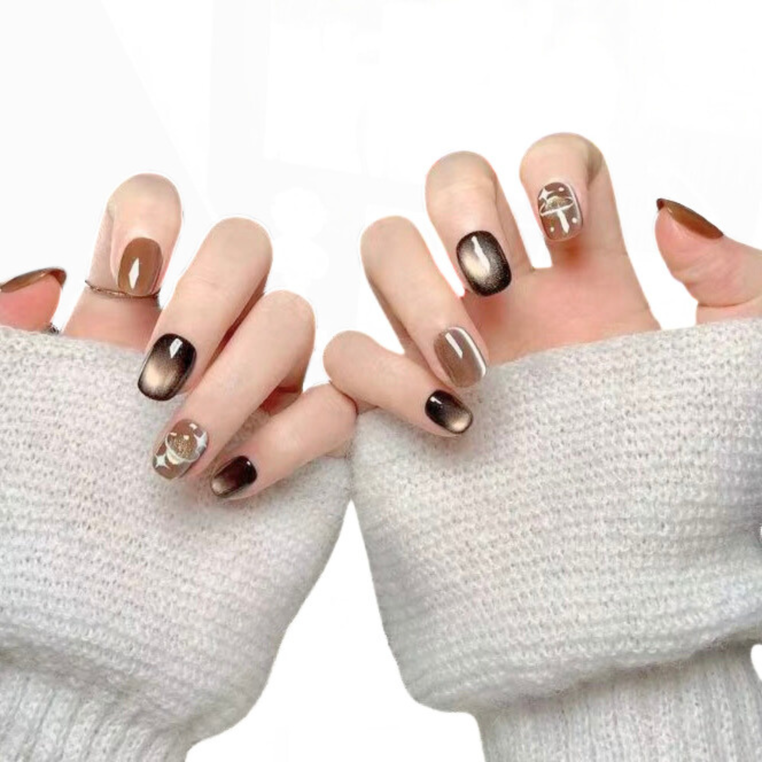 Moody neutrals and metallic chrome accents create a dreamy, futuristic look. Modern and edgy, inspired by cosmic beauty and night-sky elegance.