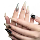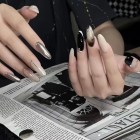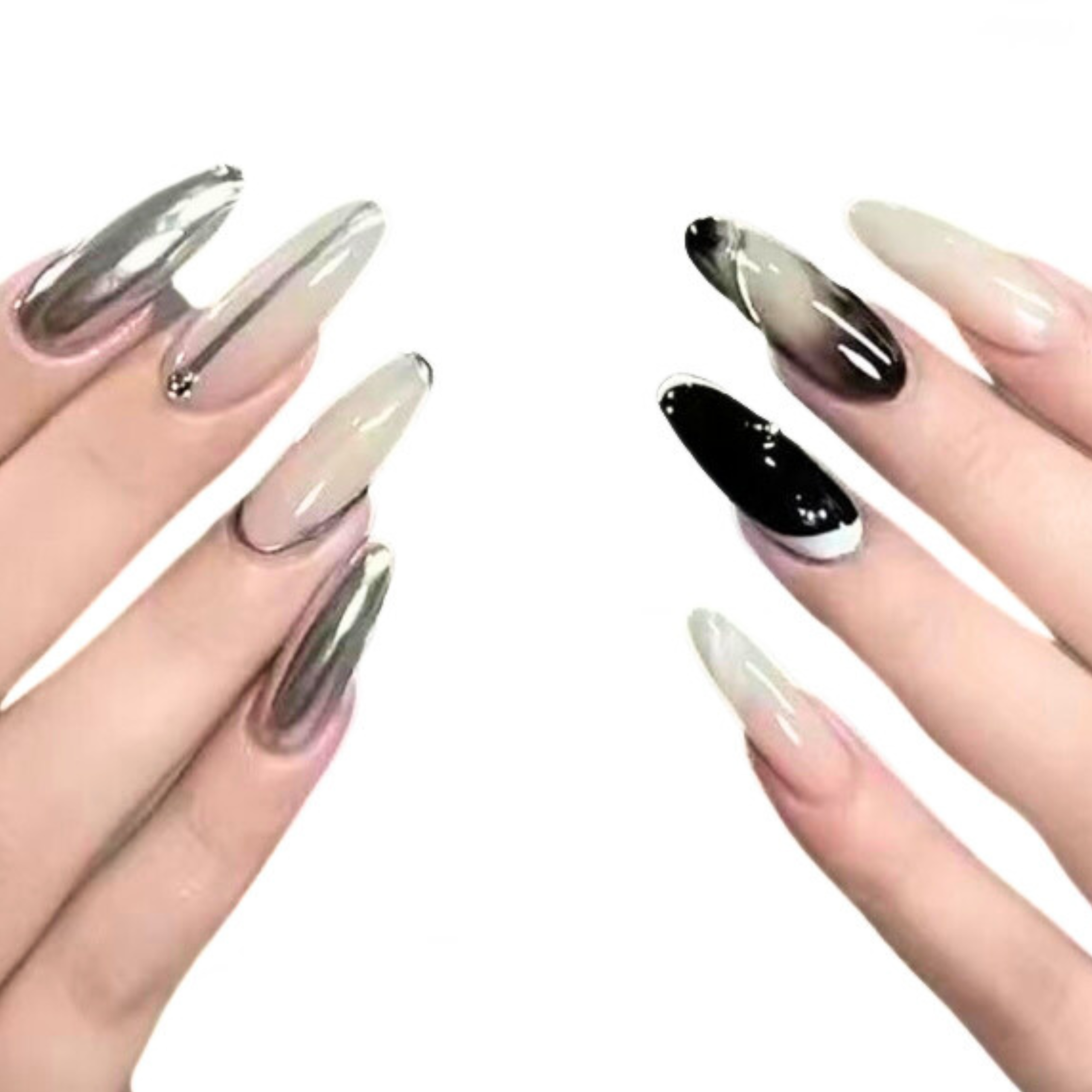 These nails are an elegant almond shape with a mixed palette of silver chrome, black, and nude bases. The look is a sleek, multi-tone metallic design, often with abstract, swirling patterns that evoke a stormy sky.
