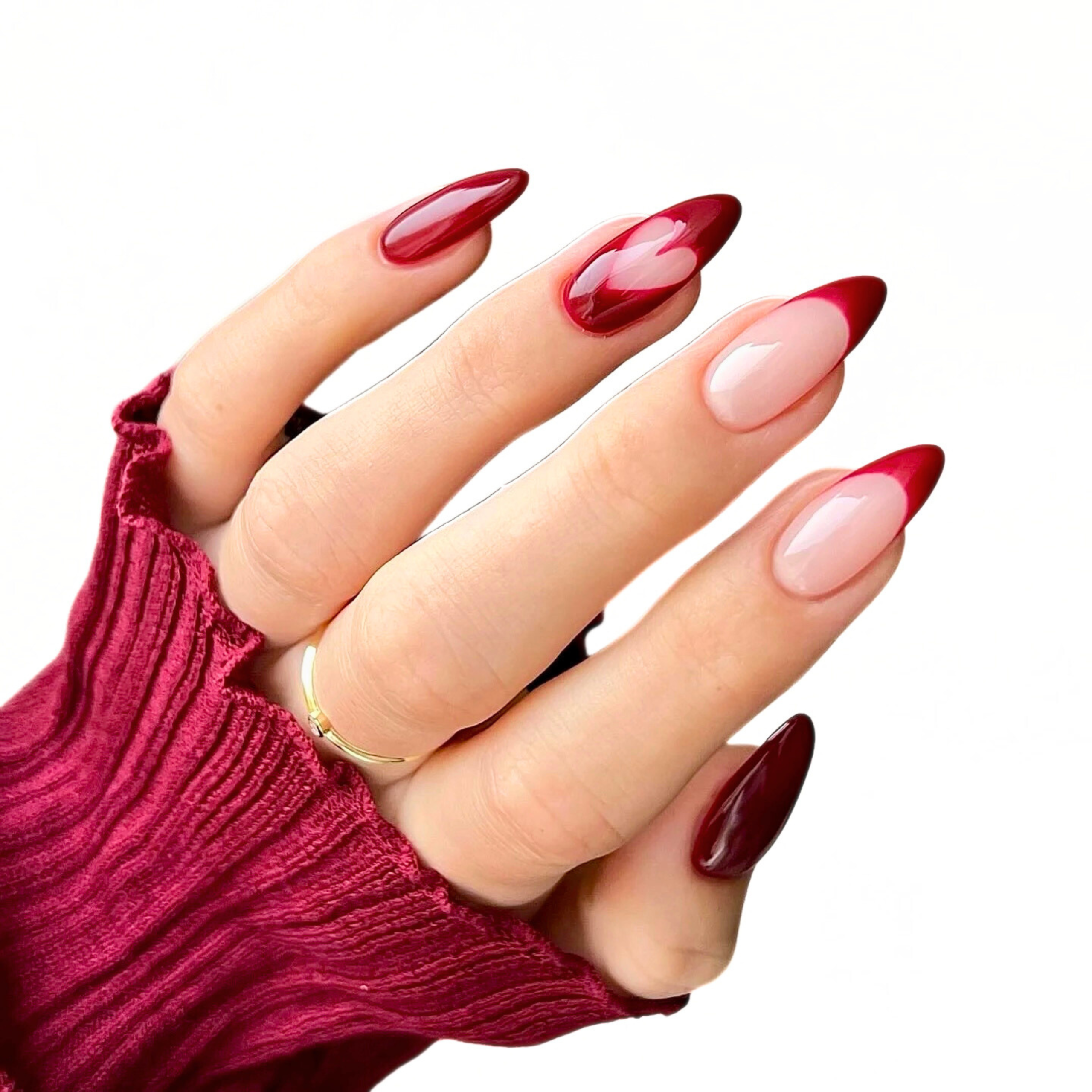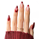 A modern take on the French manicure on a natural base. The tips feature a deep, rich, burgundy-red color that blends into the nude base with an ombré or gradient effect, creating a bold, elegant look